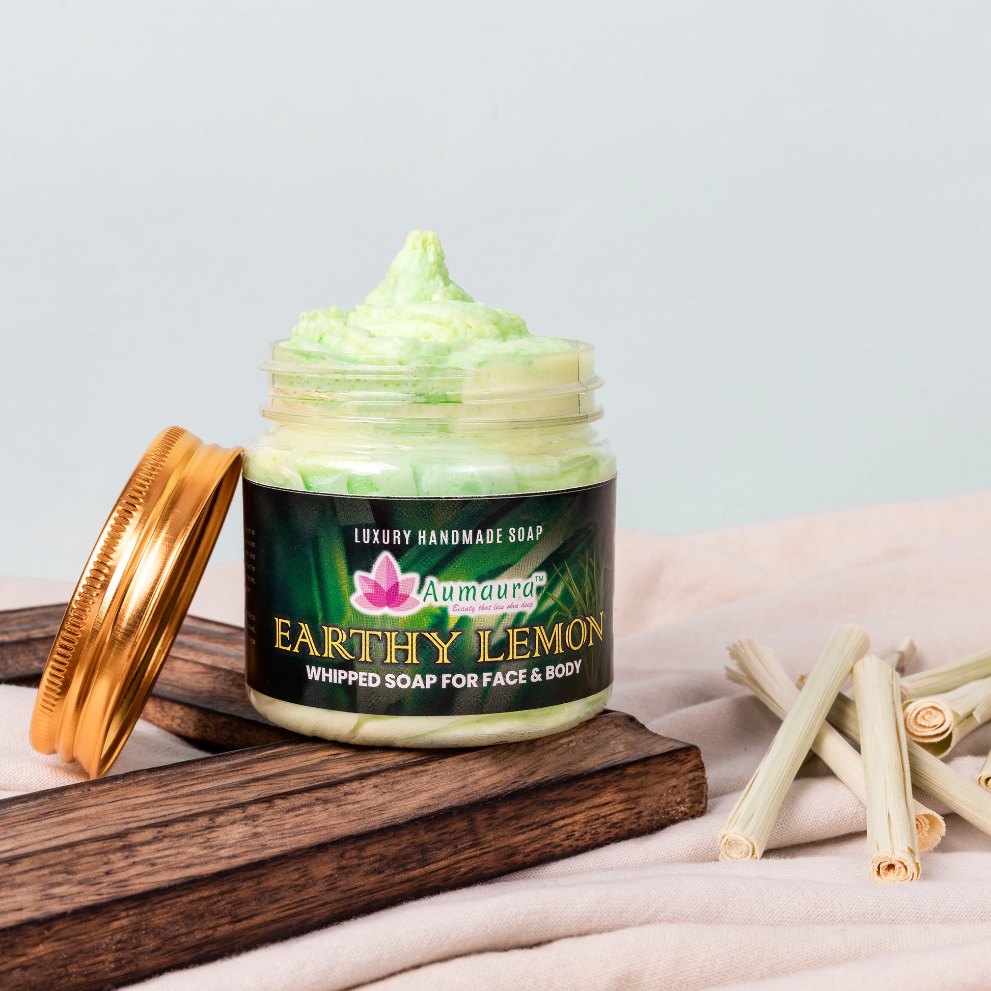 A blissful combination of hydrating butters, essential oils and fantastic aromas, the Earthy Lemon Whipped Soap has a silky-soft and creamy effect on the skin. It has a rich, moisturising texture that leaves a scent of delectable, zesty lemons on every use. Made with nourishing, delightful ingredients like Cocoa butter, Glycerine and Lemongrass Essential Oil, it's the best choice for a refreshing shower or bath.