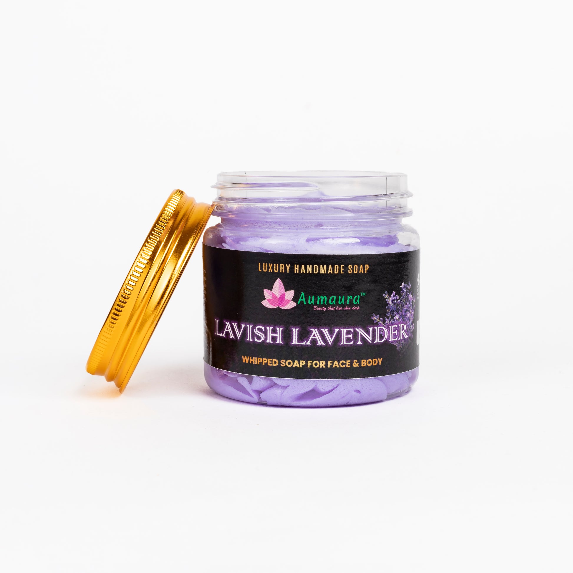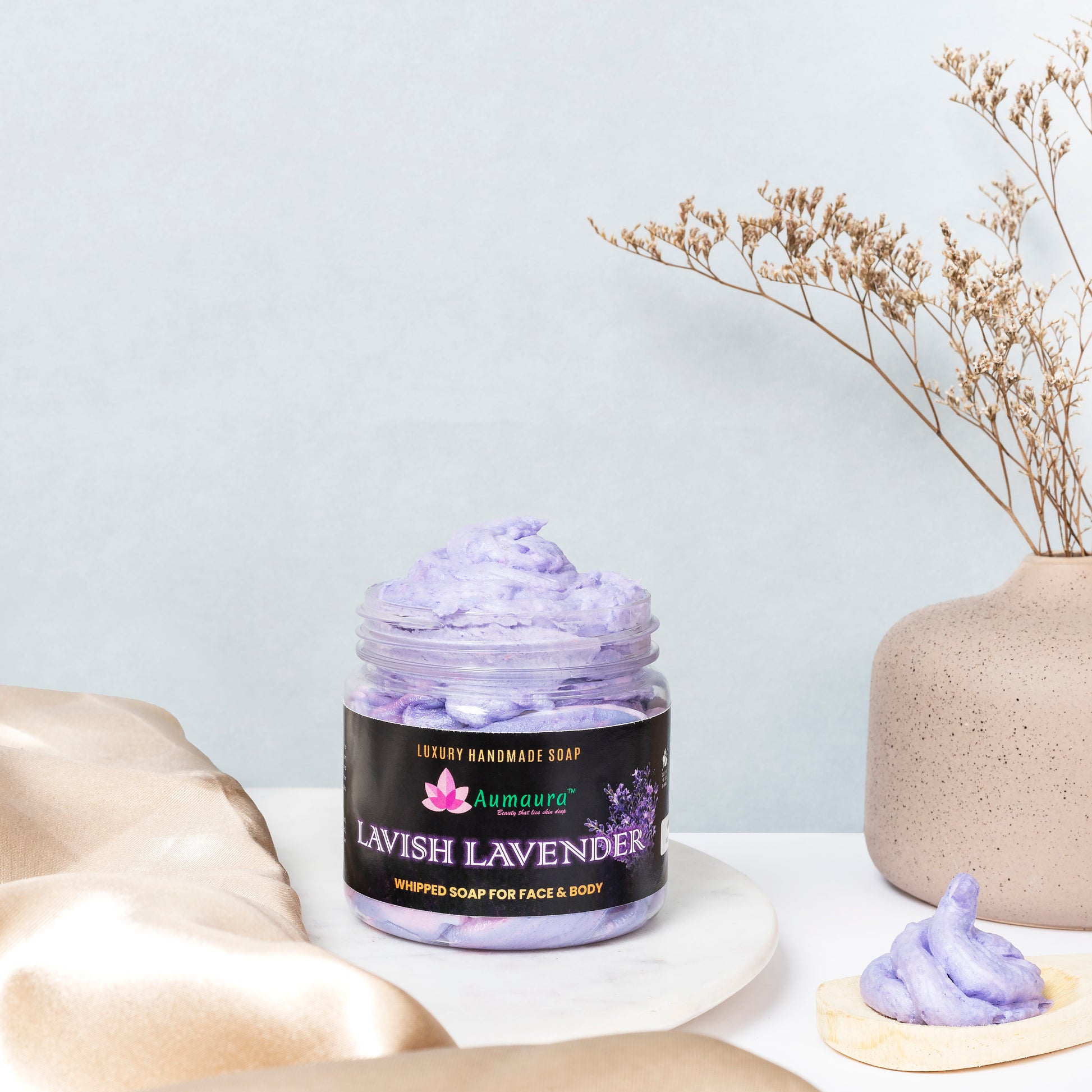 Evoke confidence by beginning your day with an intense shower wrapped in fresh fragrances. Aumaura's refreshing Lavish Lavender Whipped Soap contains natural ingredients like Aqua, Olive Oil, Extra Virgin Coconut Oil, and Cocoa Butter. Aqua softens rough and dry skin and washes away unwanted dirt and grime, Cocoa Butter deeply moisturises the skin and diminishes scars. Additionally, the anti-acne and anti-inflammatory properties of Lavender Essential Oil revives the skin and leaves you relaxed all day long.