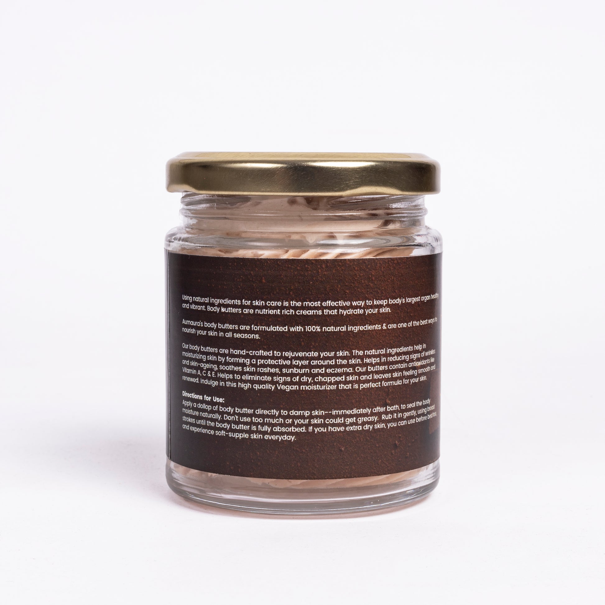 - Apply a generous scoop of body butter directly to your skin and gently massage into skin using firm, broad strokes.