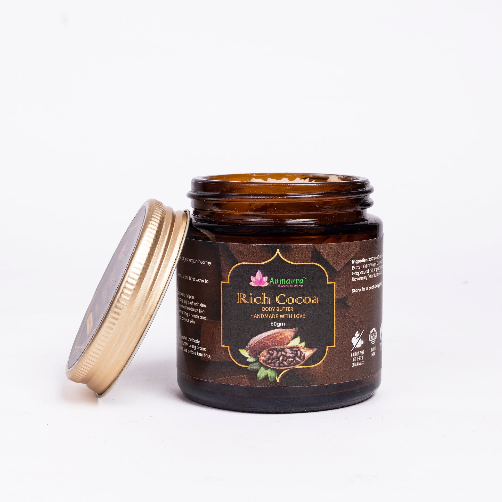 Cocoa Butter, Shea Butter, Kokum Butter, Extra Virgin Coconut Oil, Jojoba Oil, Grapeseed Oil, Argan Oil, Vitamin E, Rosemary/Mint Essential Oil.